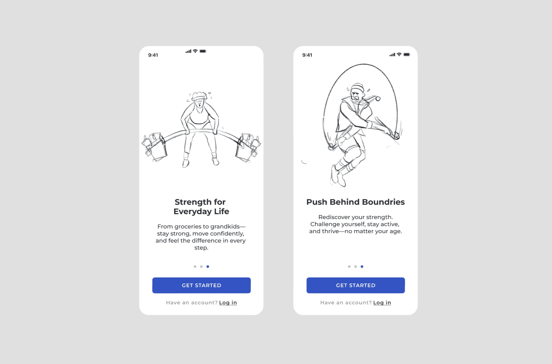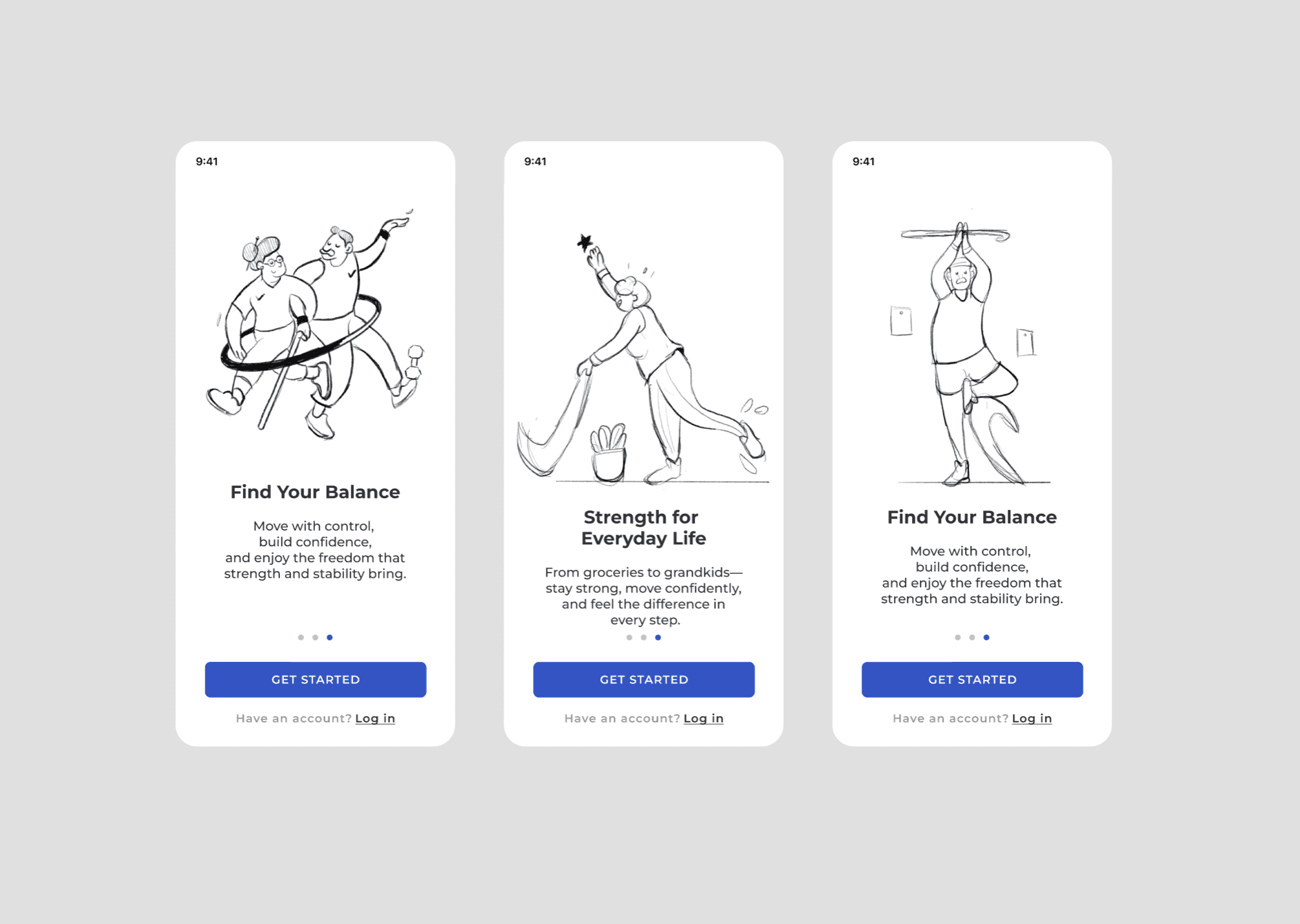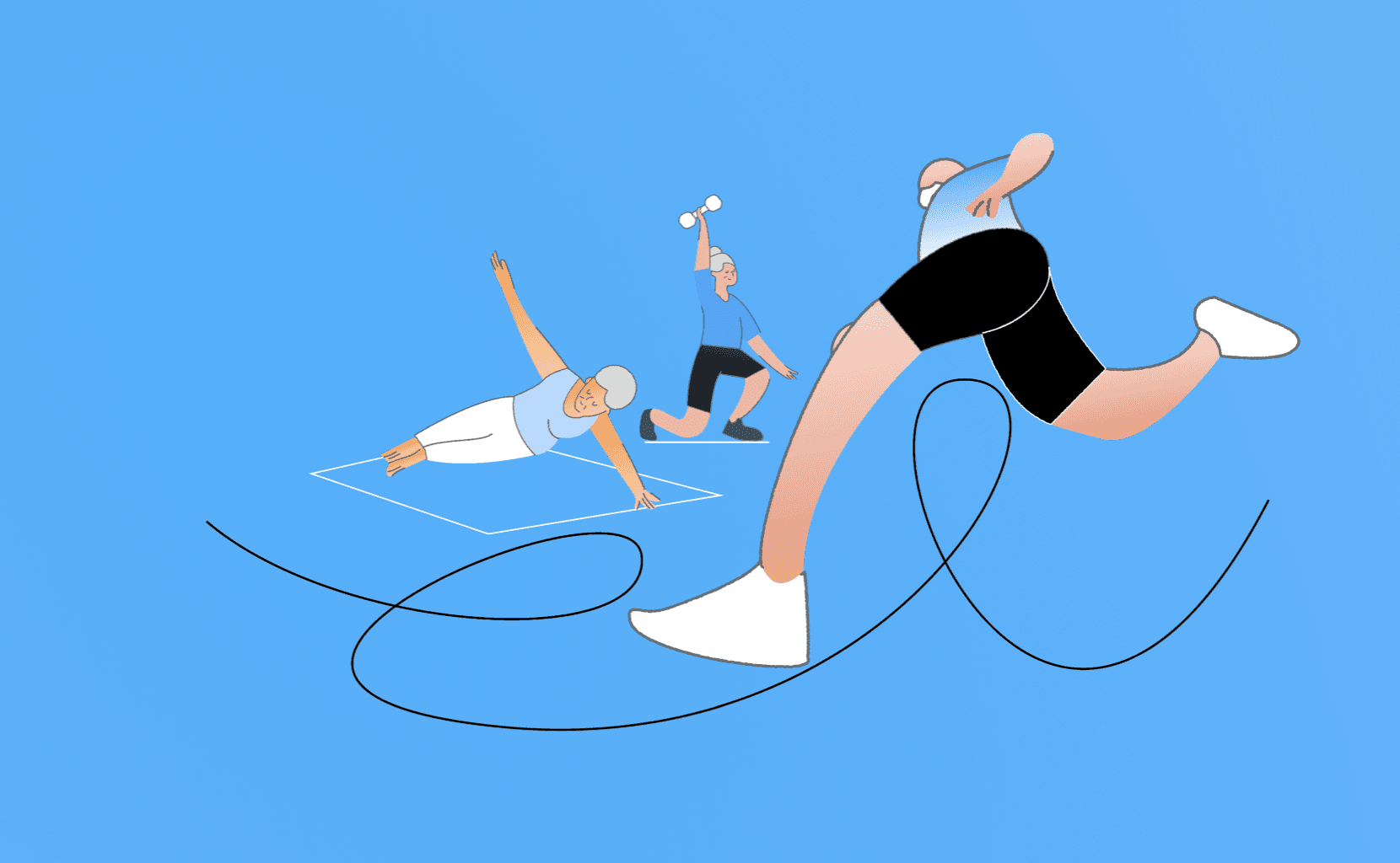 The illustrations are crafted to make the app feel inviting, age-inclusive, and joyful. They feature older adults in dynamic, optimistic poses performing familiar exercises like stretching, strength training, and walking with friends.
